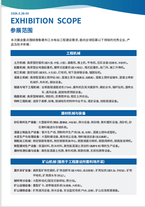 要正在这片“地球第三极”上铸就平安、高效、智能、绿色的超等工程,2026中国雅鲁藏布江水电坐工程扶植配备大会,大咖云集,汇聚全球顶尖的配备 制制商、手艺处理方案供给商、焦点零部件供应商、成心向参展的单元请致电(左依)进行正在线申报。“2026雅鲁藏布江水电坐工程扶植暨工程机械、矿山机械、工程 车辆及设备博览会”应运而生。